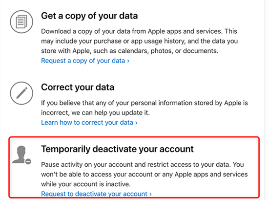如果您想刪除Apple ID帳戶以不使用一段時間,則實際上可以選擇停用該帳戶。這基本上是帳戶刪除,但這只是暫時的。如果您想在設備上再次使用帳戶,則可以重新激活它。
