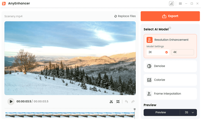 只需上傳您的視頻,選擇一個 AI 模型,然後讓 AnyEnhancer 發揮它的魔力。它適用於 Windows 和 Mac。此外,它還提供實時預覽和多種導出選項。非常適合任何想要以最少的努力獲得專業品質視頻的人。