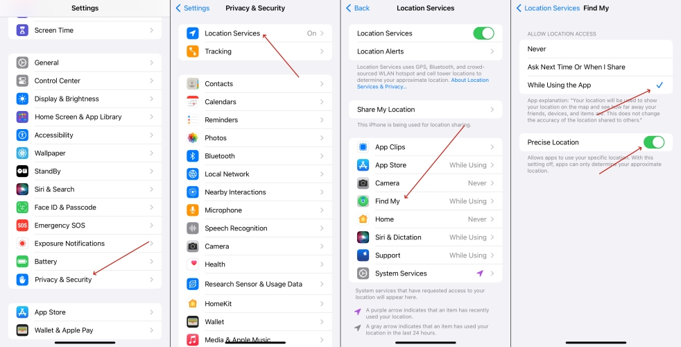 步驟 3.選擇查找我的並點擊使用應用程序時。接下來,啟用精確定位選項。