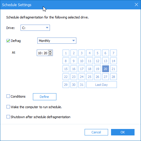 步驟4.在新彈出的窗口中,選擇要進行碎片整理的驅動器,設置碎片整理的特殊時間,然後單擊“確定”。然後點擊“條件”來設置碎片整理操作的程度。