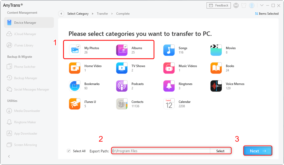 步驟2。接下來,您需要選擇要傳輸的文件類型(或僅選擇所有數據)> 更改導出路徑如果您需要 > 單擊下一個按鈕開始傳輸過程。