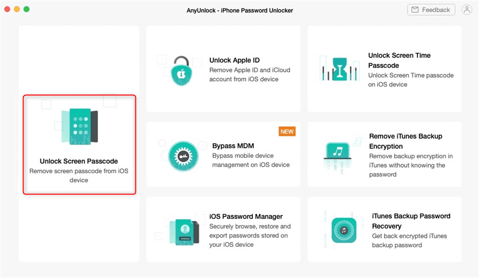 步驟 1. 下載並啟動 AnyUnlock在您的計算機上,並將您的 iPhone 連接到它。當 AnyUnlock 檢測到您的設備時,單擊解鎖屏幕密碼。