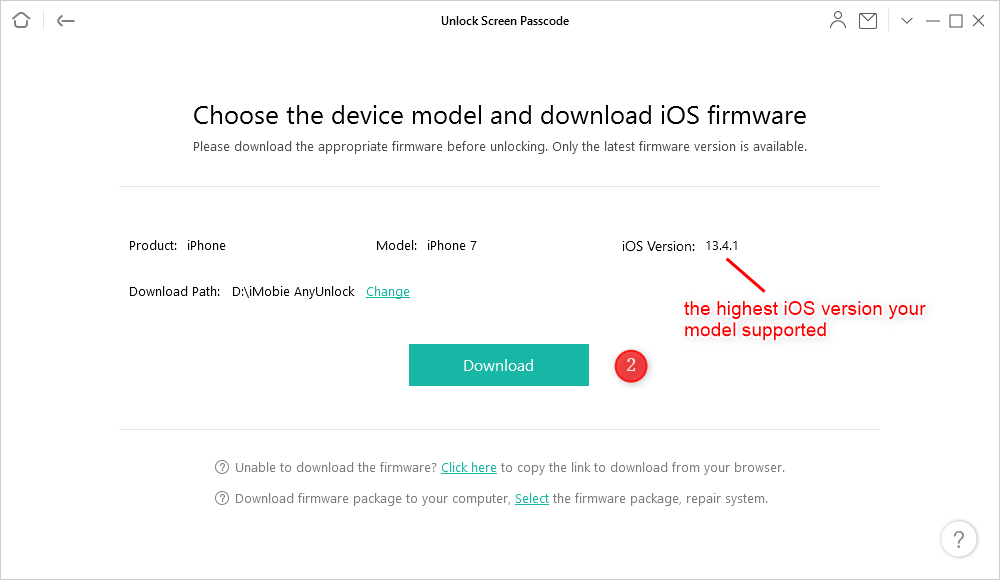 步驟2。按照屏幕上的說明進行操作讓您的 iOS 設備進入恢復模式> 下載iOS固件,用於解鎖屏幕密碼。下載包可能需要很長時間,請耐心等待。