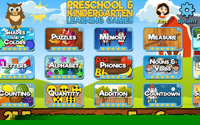 該應用程序有 36 個精彩的謎題,供您的孩子培養他或她的認知能力。除了字母和數字之外,您的孩子還可以學習動物的名稱和它們發出的聲音、不同車輛的聲音、電器的名稱、海洋生物、形狀和顏色的名稱、不同物體的相似之處,例如交通工具、動物、水果、衣服、魚、昆蟲、廚具、工作工具等。