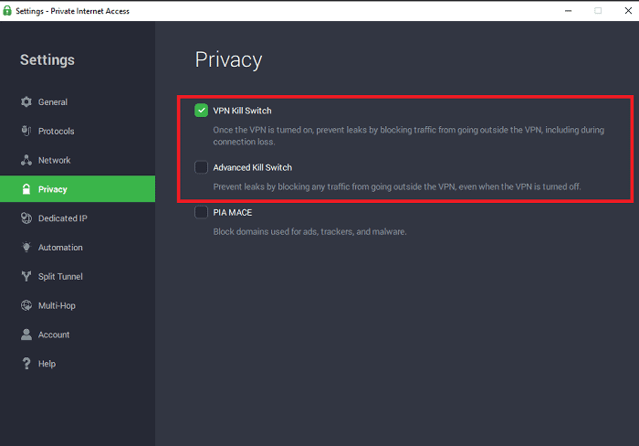 - 啟用終止開關。如果您的 IP/DNS 詳細信息在 VPN 連接斷開時洩漏,則可能無法啟用終止開關。確保選中該框。