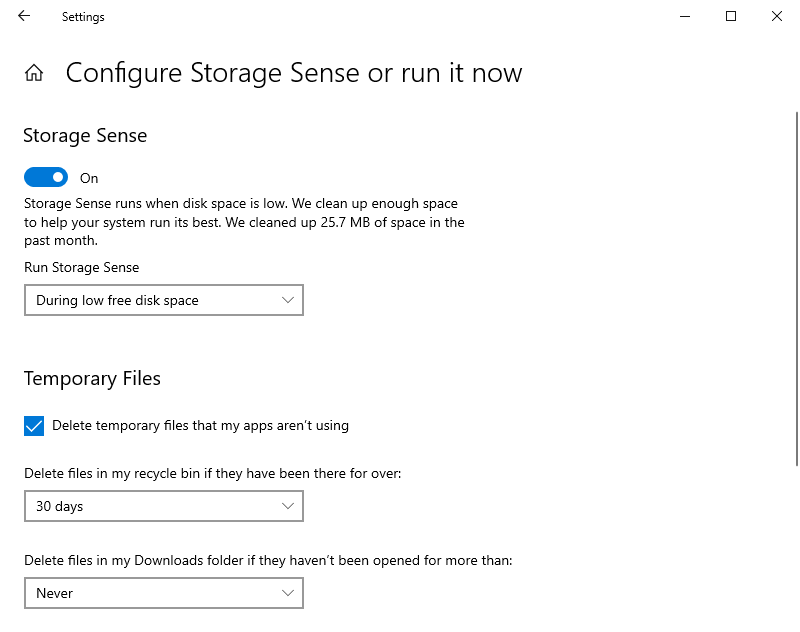 Storage Sense 可以通過識別和刪除不必要的文件(例如臨時文件、系統緩存和回收站內容)來自動執行釋放磁盤空間的過程。通過提供自定義設置,它還可以讓您指定清理文件的頻率和標準。