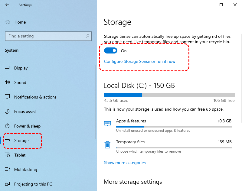 步驟2。導航至“貯存”並啟用“存儲感”。然後,單擊“配置存儲感知或立即運行”繼續。