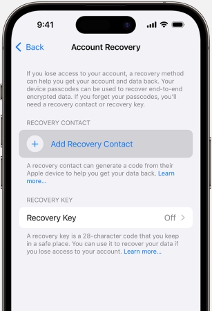 最後,一個鮮為人知的方法是使用恢復聯繫人來找回 iCloud 密碼。我們相信以前沒有多少人嘗試過這一點。需要注意的是,在重置iCloud密碼之前,您需要設置恢復聯繫人。