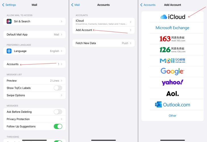 。添加帳戶 > iCloud步驟2。選擇郵件 > 帳戶然後點擊