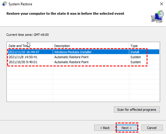 步驟 4:選擇發生“設備設置未遷移”錯誤之前的還原點。單擊“下一步”,耐心等待系統恢復過程完成。