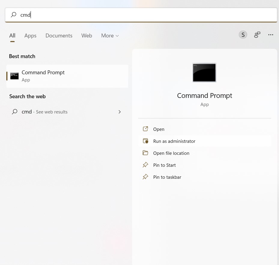 步驟2:在最佳匹配結果下找到命令提示符,然後單擊“作為管理員運行”。