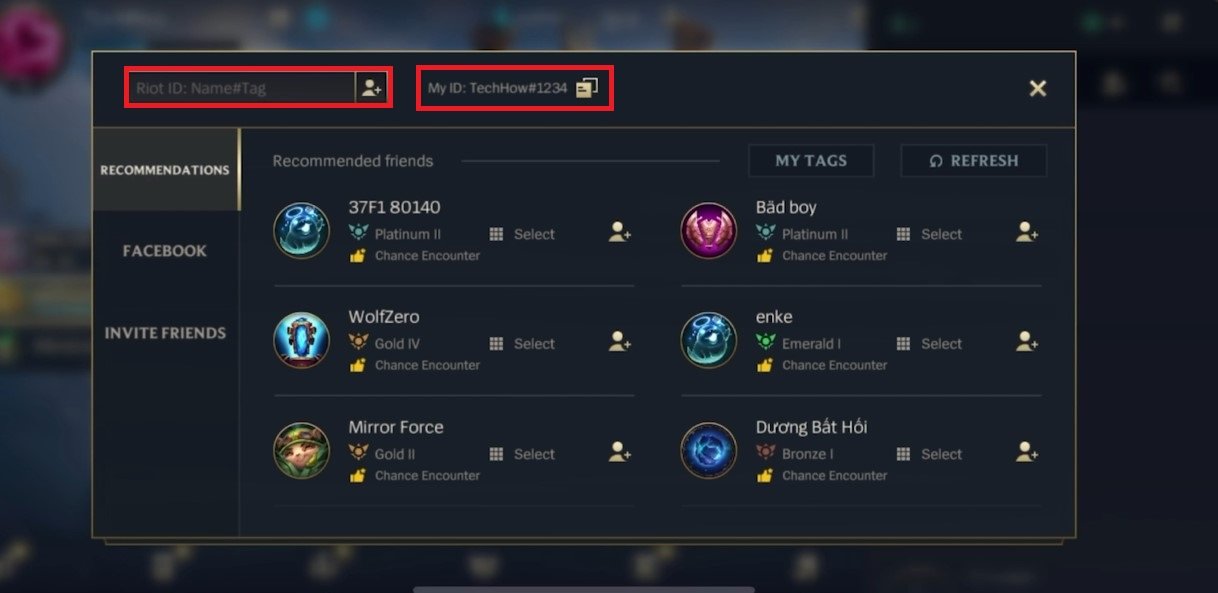 點擊添加好友圖示.您可以輸入 Riot ID,然後輸入姓名標籤來查找您想要添加的用戶。在它旁邊,您可以看到您的 ID,可用於添加您。如果您連接了 Facebook 帳戶,您還可以預覽好友推薦以及擁有以下游戲的 Facebook 好友。
