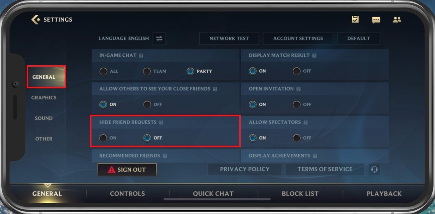 Wild Rift 設置 > 常規 > 隱藏好友請求