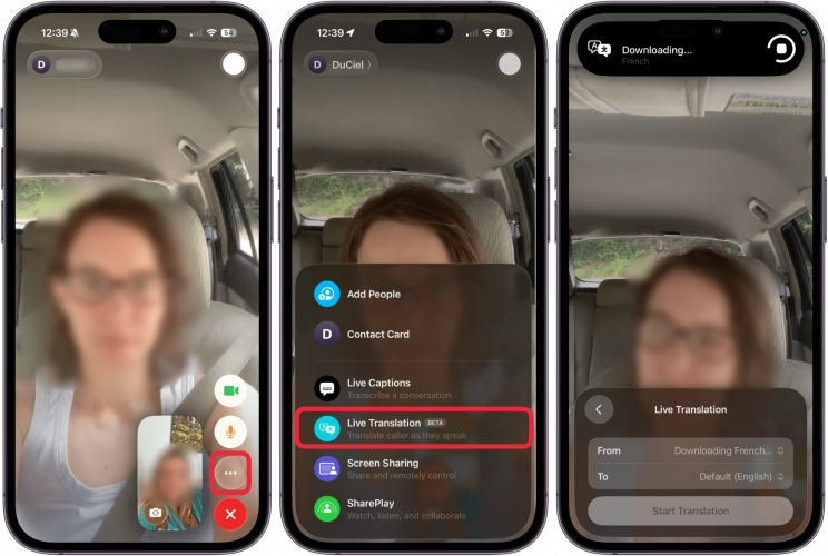 步驟1。前往 FaceTime 進行視頻通話,點擊三點圖標並選擇實時翻譯。