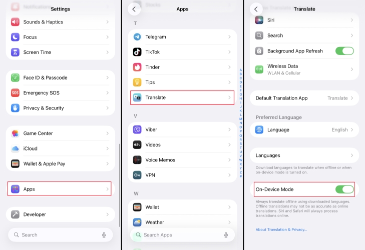 - 隱私保護:翻譯過程是使用 Apple Intelligence 在設備本地完成的。下載語言包以供離線使用的選項。