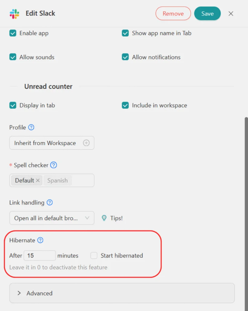 您還可以設定不活動的時間限制,然後該應用程序是休眠。在同一設置面板中,選擇應用程序在進入睡眠狀態之前應保持活動狀態的時間。在那之後,Rambox 會自動暫停,這樣它就會停止發送通知,並且不會坐在那里分散您的注意力。你使用它,完成你需要的東西,它就會悄悄地走開。