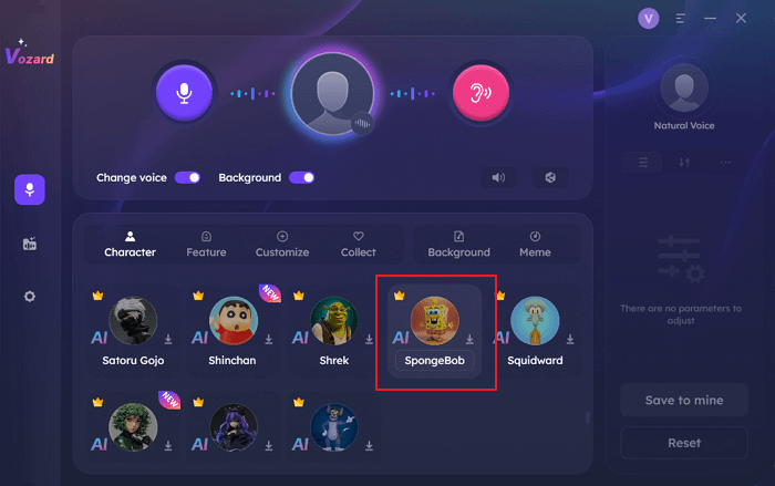 按照這裡的步驟看看如何用Vozard獲得海綿寶寶的聲音,實時和錄製的變聲方法都會介紹。它提供用戶友好的界面,讓您通過簡單的步驟輕鬆將您的聲音更改為海綿寶寶的人工智能聲音。