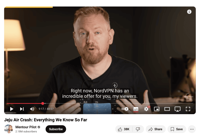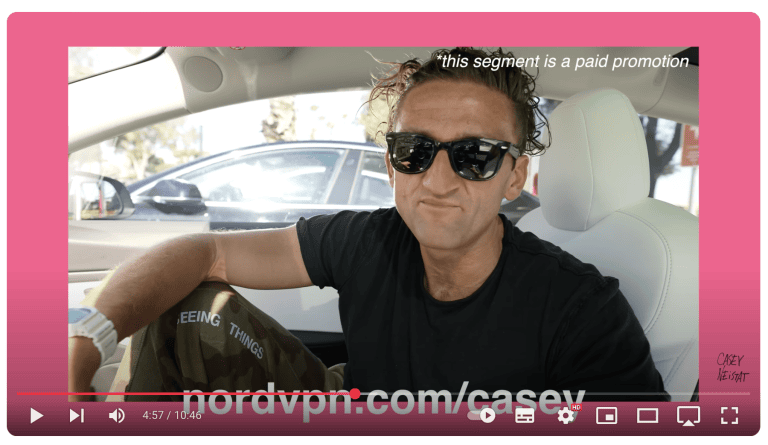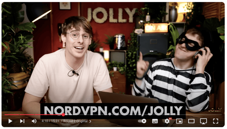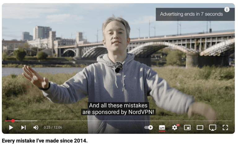 他集成了 NordVPN在有關互聯網安全和個人數據的視頻中,經常將服務與數字保護主題聯繫起來。
