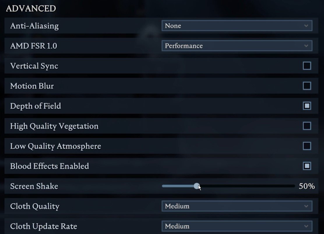 最後,我更喜歡降低屏幕抖動選項為 50% 並設置布料品質和布料更新率到中等的。最後這兩個設置會對顯卡 (GPU) 性能產生很大影響。如果您發現任何滯後,請降低布料品質設置為低的第一的。