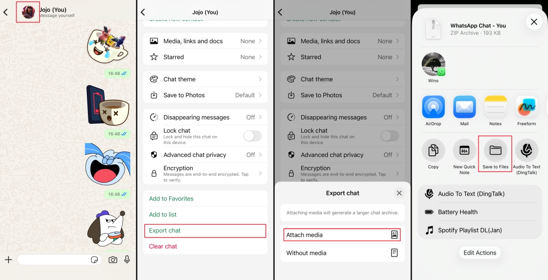 步驟2。點擊個人資料圖標並向下滾動到底部。輕敲導出聊天記錄並選擇附加媒體導出帶貼紙的聊天記錄。