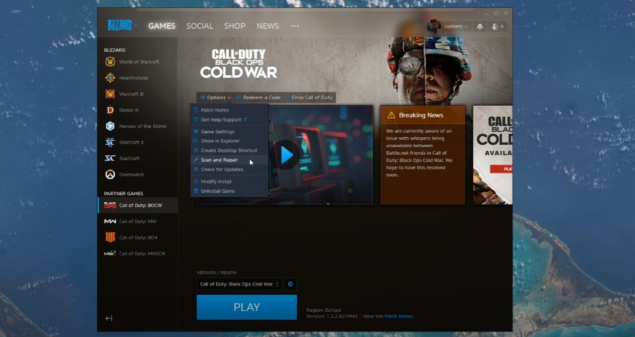 確保您的遊戲文件沒有損壞並且是最新的。在你的暴風雪啟動器,選擇選項黑色行動冷戰和掃描並修復。重新下載並替換任何丟失或損壞的遊戲文件將需要一分鐘的時間。