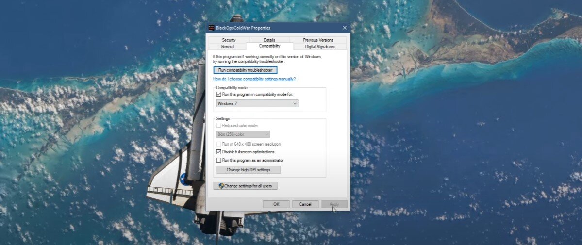 最後,打開文件資源管理器並導航到保存遊戲的驅動器。前往程序文件,在“使命召喚:黑色行動冷戰”文件夾中,右鍵單擊文件大小最大的“黑色行動冷戰”應用程序。選擇特性。在相容性選項卡,以兼容模式運行程序視窗7, 和禁用全屏優化。不要忘記應用您的更改。