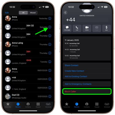 - 在列表中找到您收到的騷擾電話,然後點擊旁邊的信息圖標(帶圓圈的小寫“i”)。