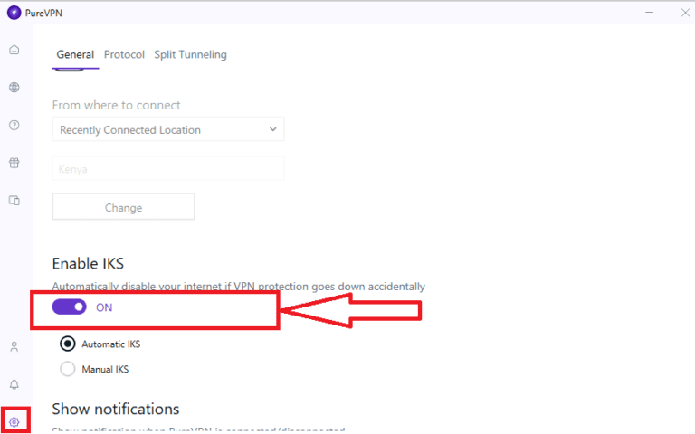 - 前往左下角儀表板上的設置並啟用 IKS 功能。如果 PureVPN 連接意外斷開,這會自動禁用您的互聯網連接。