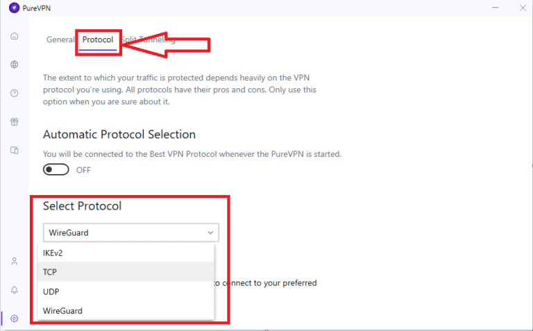 - 在同一窗口上,點擊“協定” 選項卡。WireGUard 是最快的, 但OpenVPN是繞過防火牆的最佳選擇。