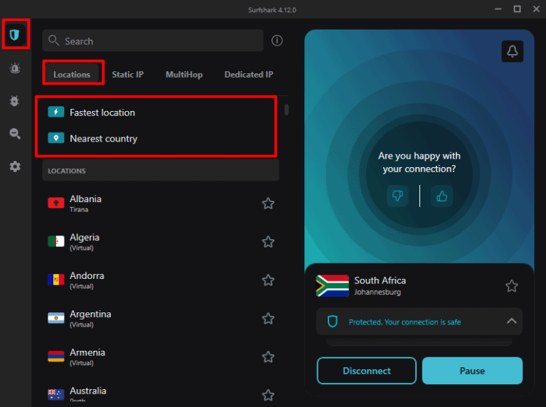 - 連接到適當的 Surfshark 服務器位置。考慮連接到單位數或兩位數 ping 服務器位置享受快速、無延遲的《命運 2》體驗。前往VPN>地點>最快的位置/附近的國家對於最低 ping 服務器。