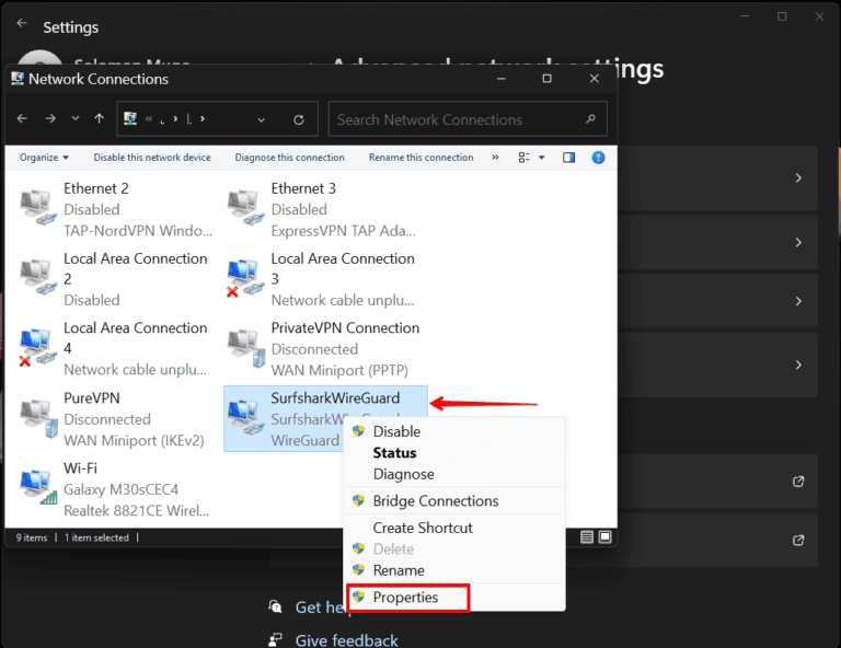 - 右鍵單擊“Surfshark WireGuard”並選擇“特性”。