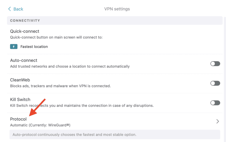 - 選擇 ”VPN 設置,“ 其次是 ”協定”。