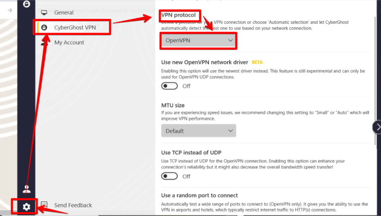 - 單擊設置/齒輪圖標,然後經過CyberGhost VPN>VPN協議>開放VPN。