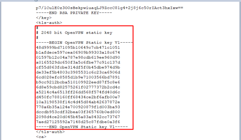 - 打開 .ovpn 文件並將內容複製到<tls-auth>和</tls-auth>標籤到TLS 驗證密鑰場地。