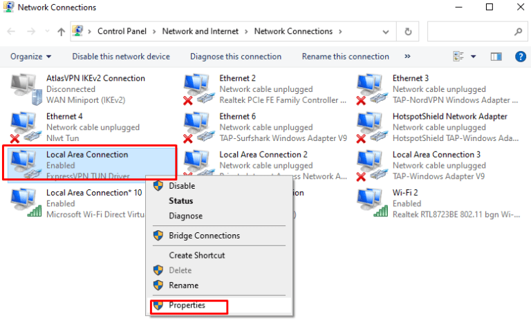 - 右鍵單擊活動ExpressVPN 本地連接並選擇特性。