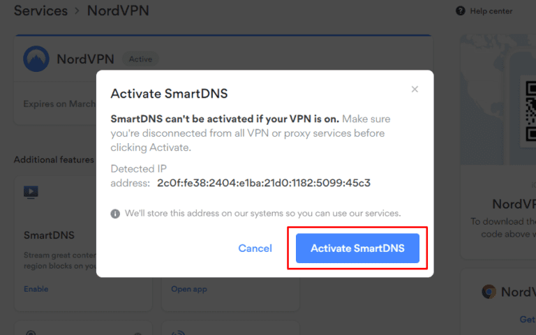 - 出現提示時,單擊“激活智能DNS”。這會將您的 IP 地址列入白名單,以便您在連接到 WiFi 網絡的兼容設備上使用 Smart。