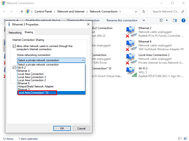 - 點擊 ”選擇專用網絡連接”,然後選擇您之前創建的移動熱點。您可以在網絡連接窗戶下的Microsoft WiFi Direct 虛擬適配器。在我們的例子中,它是本地連接* 10。