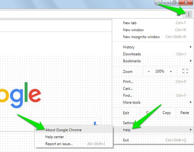 2.這裡移至“幫助”選項並選擇“關於谷歌瀏覽器”從它。