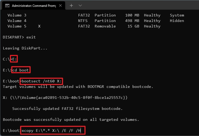 • xcopy E:*.* X: /E /F /H(將 E 和 X 更改為包含 Windows 11 ISO 映像和 USB 的驅動器)
