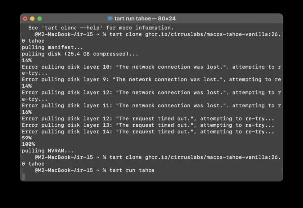 另外,當嘗試使用 tart 克隆或下載 MacOS Tahoe beta 映像時,您可能會看到各種錯誤消息,如下所示: