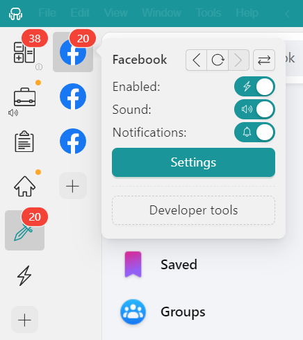 你準確決定通知的顯示方式和時間,讓您隨時了解情況,不受干擾。需要在關鍵工作時間暫停通知? Rambox 為您提供支持。只需快速將通知靜音右鍵單擊您的 Facebook 帳戶或整個工作區,立即創建一個專注、不受干擾的區域。