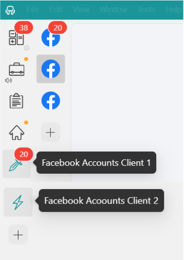 - 工作區客戶端 1– 品牌 A 的 Facebook 帳戶/品牌 B 的 Facebook 帳戶/Slack 或 Microsoft Teams 等通信應用程序,以便與您的客戶無縫協作。