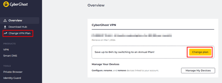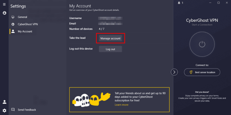 - 點擊 ”管理賬戶”將被重定向到您在 CyberGhost 網頁上的個人資料。