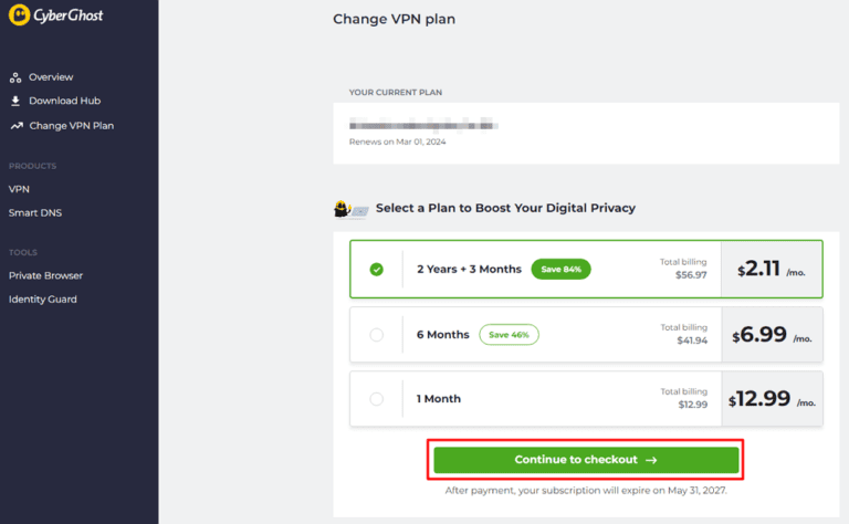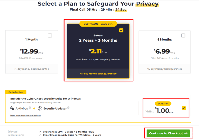 - 選擇一個計劃。我推薦2年計劃以最優惠的價格獲得長期利益。 I also got the CyberGhost Security Suite for Windows for$1.00/月與2年計劃。