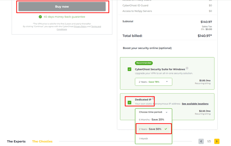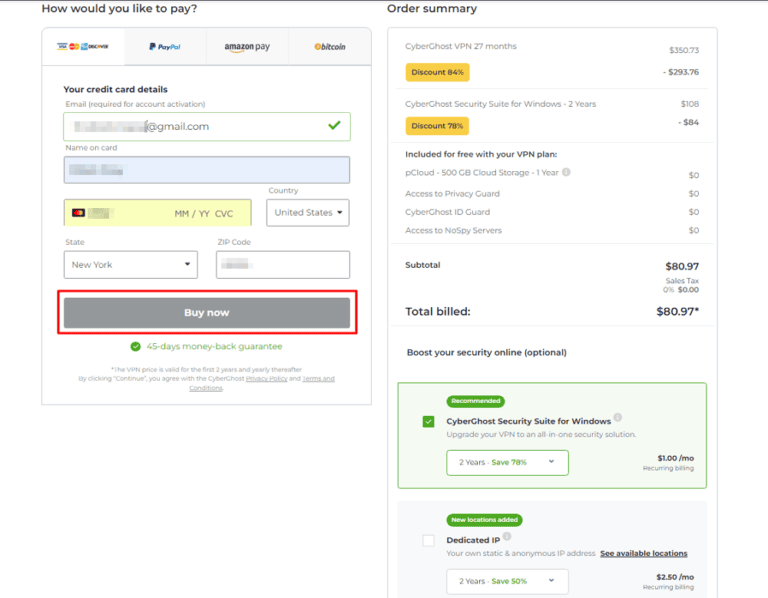 - 選擇您的首選付款方式,輸入您的付款詳細信息,然後單擊“立即購買”。 (可選)添加 CyberGhost 的“專用IP,”我將在下面討論。
