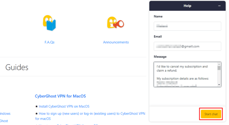 - 輸入您的姓名,電子郵件,以及申請退款的意向,然後點擊“開始聊天”。