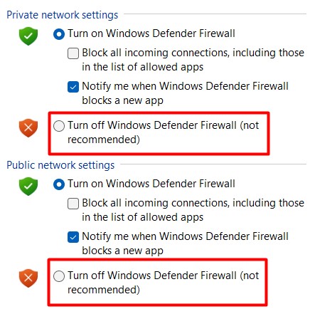 4.你會看到“關閉 Windows Defender 防火牆(不推薦)”在“專用網絡設置”部分下和在“公共網絡設置”部分;單擊兩個部分下此選項旁邊的圓圈