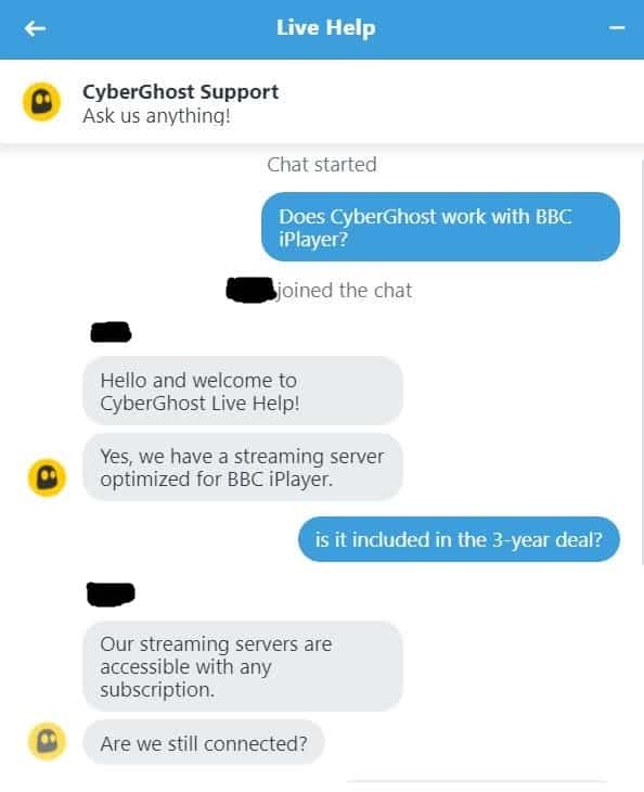 所有這些套餐均包含 BBC iPlayer 流媒體,如下面的實時聊天支持所證實: