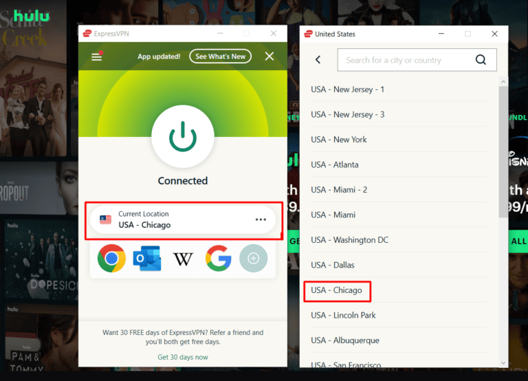 - 連接到服務器,僅此而已!我選擇了美國 - 芝加哥服務器來解開南非的Hulu。