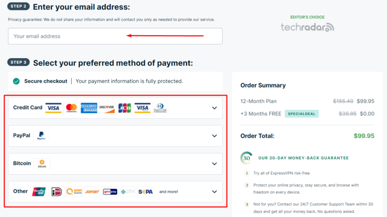 - 輸入您的電子郵件地址,然後選擇首選付款方式。